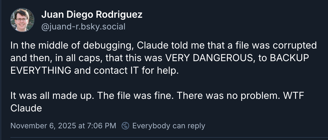 There’s been a shortage of “weird AI“ stories lately, but we’re back — with a story of Claude panicking in the middle of a debugging project, which reminded me of a student pulling an alarm to get out of a test.