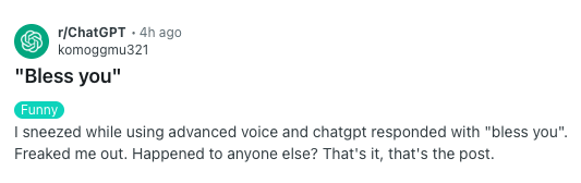 Other comments included ChatGPT responding to a dog barking with "Oh, seems your dog has something to say too,” responding to a big sigh after a workout with “That sounds like it was a good workout and you're ready for some rest!" and telling a drunk person they need to relax, they’re slurring their words and need to sip some water and go to bed.
